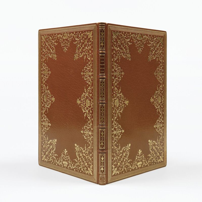 Bound in full Havana morocco. Ribbed back decorated with golden boxes. Golden fillets on the dishes framing a brass band decoration. Dishes lined in azure morocco decorated with a decoration of small irons. Gilded edges on witnesses. Silk guards. Binding signed JOLY. R.D.