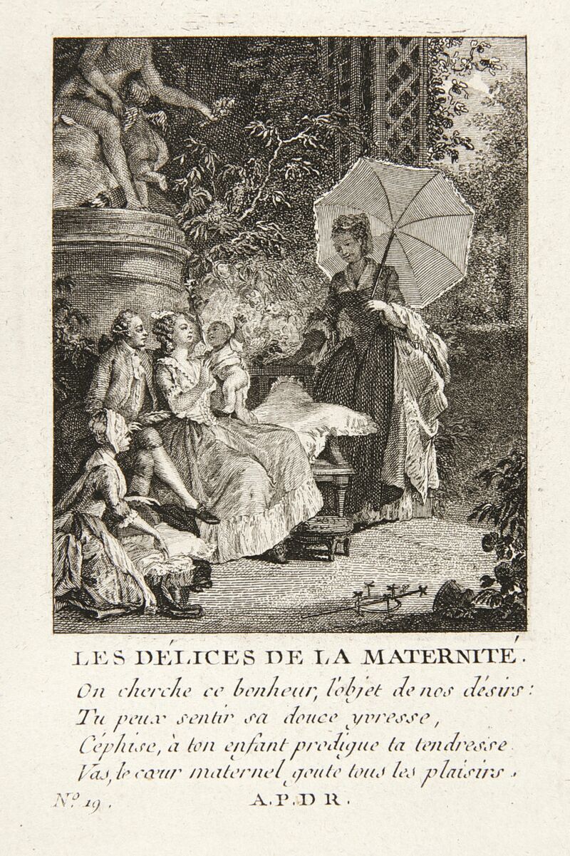 Composed of 12 stamps mounted on tabs numbered from 13 to 24. This series had been preceded in 1775 by a first series, also of 12 pieces, engraved after Freudeberg's drawings. It was followed in 1783 by a third one, for which Moreau the Younger still provides the drawings. In this second suite, a woman of the right tone is described from her motherhood to the first outing and her occupations with her child.