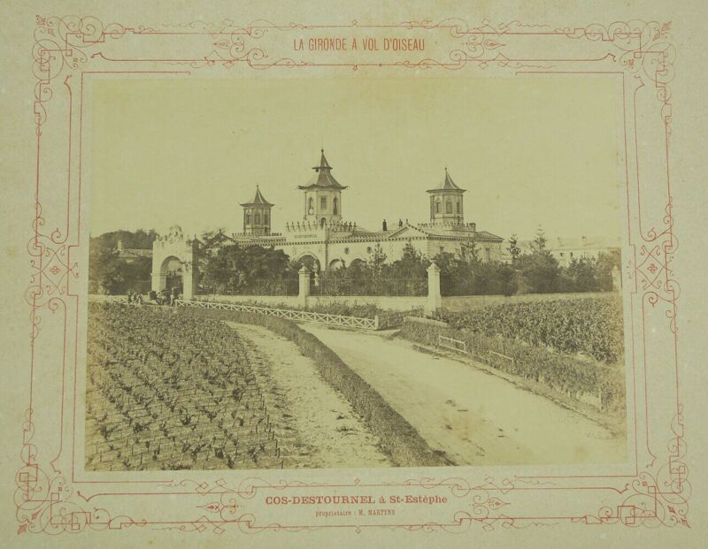 Beautiful publication illustrated with 54 photographic prints on albumen paper, each one pasted on strong paper with red frame captioned (names of the castle and its owner) and surmounted by the mention "La Gironde à vol d'oiseau".