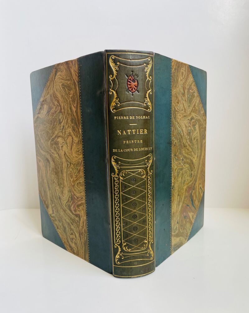 Blue half-marrow binding with corners. Smooth spine finely decorated with golden fillets and florets. Gold dotted dots on the sides of the boards and a small palette of mosaic paint. Marbled guards. Top edge gilt. Original paper covers and spine bound in. Inside with tiny freckles. Illustrated with numerous laminated portraits under snakes with black and white captions, some in colour and full page.
