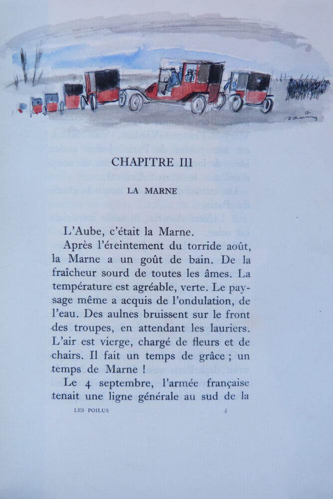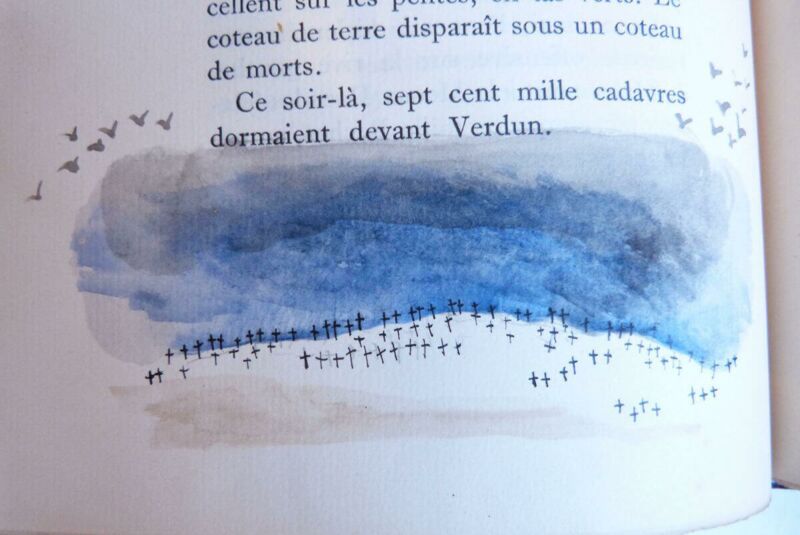 Unique copy enriched with 39 drawings ORIGINATING IN PENCIL AND PLUM, watercolour, by Maurice Savin (1894-1973), one on a full page and 38 in the margin of the text, some with the artist's signature. The latter added to the pen" illustrated by Savin " on the title page. Mobilized during the war, Maurice Savin was wounded twice and received the War Cross.