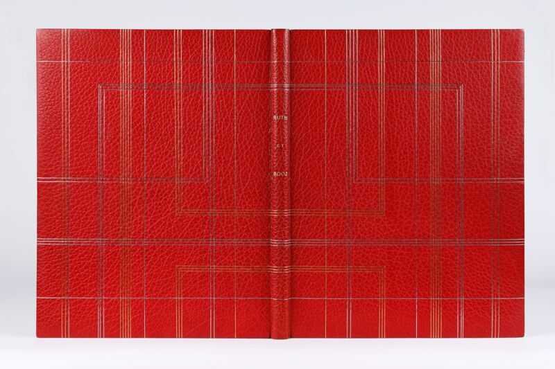 Sous étui et chemise cartonnés. Reliure plein maroquin rouge à long grain. Plats et dos couverts d’une composition géométrique de jeux de filets dorés et au palladium s’entrecroisant, encadrement intérieur orné de deux filets dorés, doublure et gardes de papier balsa. Tête dorée. Reliure signée CREUZEVAULT.