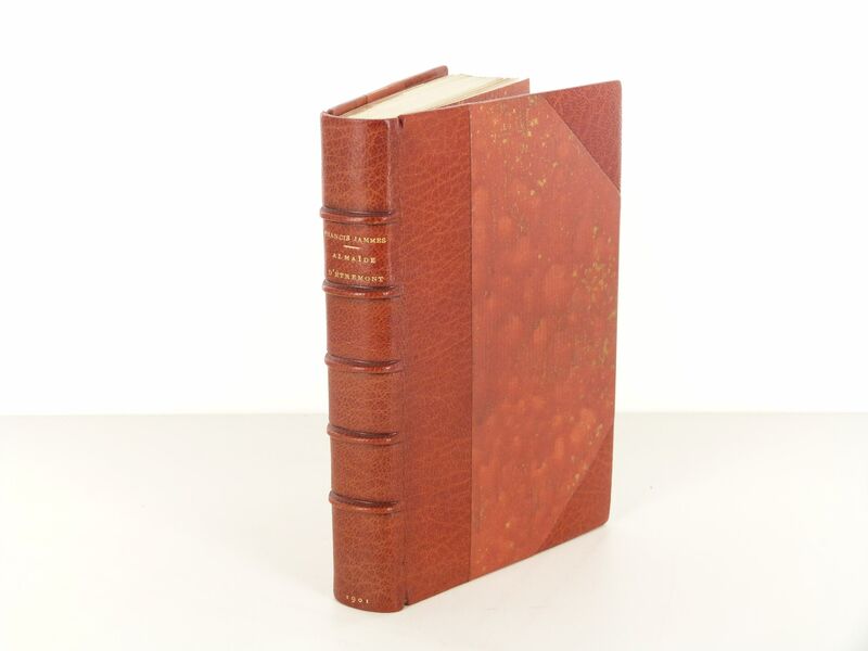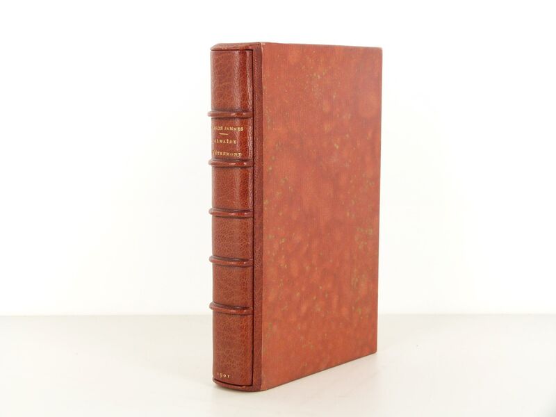 In bordered slipcase. Bound in brick half-maroquin with corners. Spine ribbed, gilt date at foot. Head gilt. Covers and spine preserved. Binding signed DEVAUCHELLE.