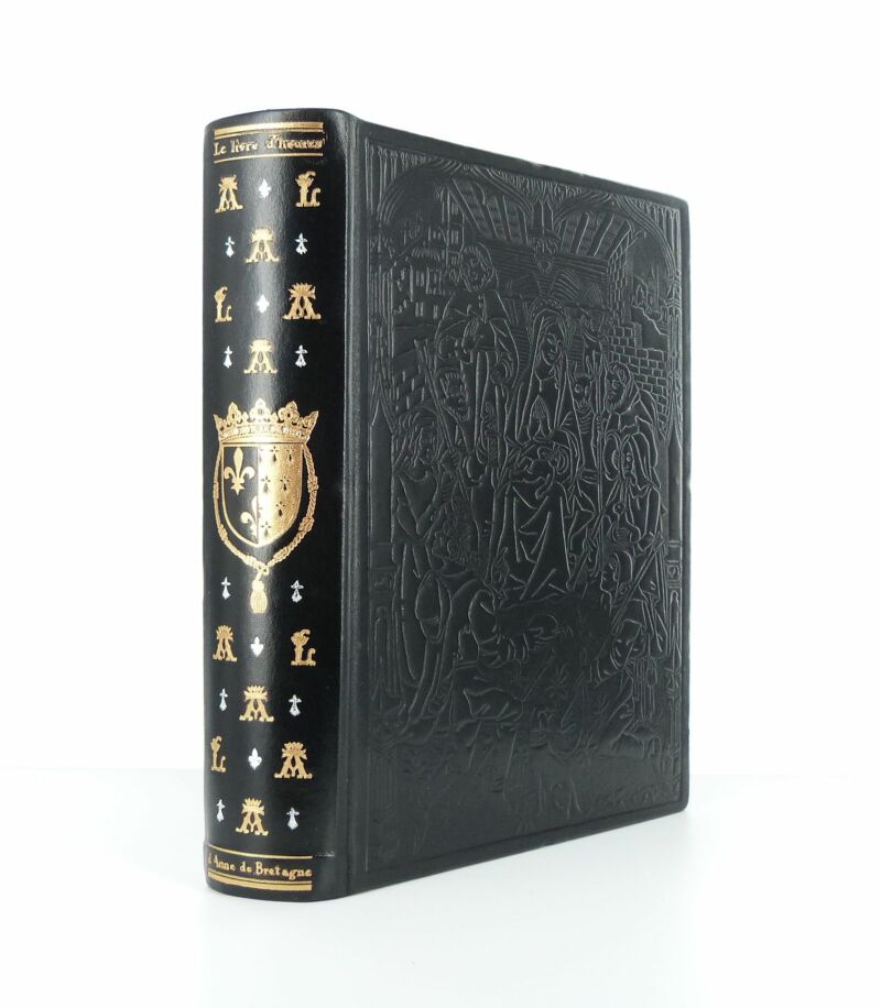 Black leatherette binding bradel. Smooth spine with gold title, gold and silver ornaments. Beautifully decorated plates in relief. Gilded headband. Red colour guards with red floral motifs. Excellent condition of the contents decorated with black and white reproductions of the pages of the original Book of Hours.