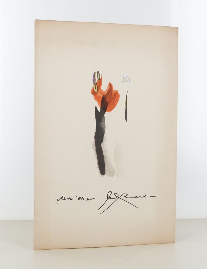 ORIGINAL EDITION LIMITED to 400 numbered copies. One of the off-market copies on Arches vellum. Complete with the photograph of Éluard on the frontispiece and the cover with a reproduction of a colored Indian ink drawing by René Char.
