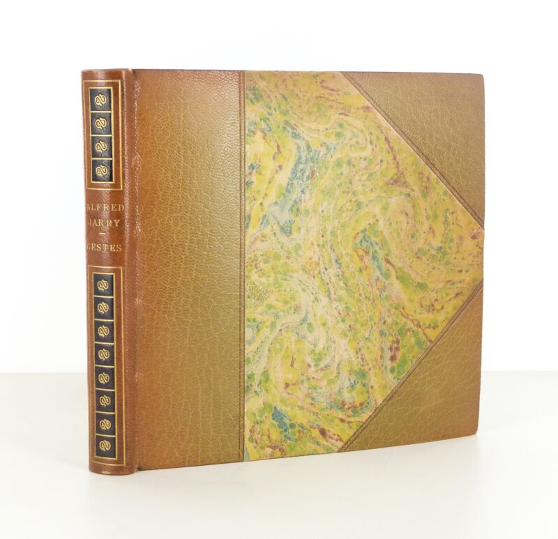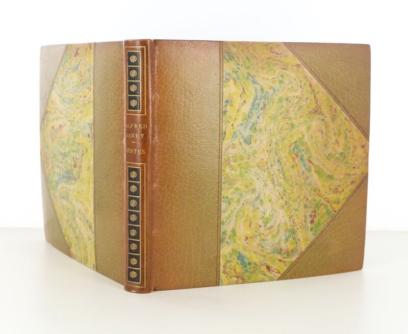 Reliure demi-maroquin marron à coins. Dos lisse avec mosaïques dorées sur petits carrés noir. Couverture et dons conservés. Reliure signée René KIEFFER. A grands témoins. Avec 7 eaux-fortes originales, dont un frontispice en couleurs. Chaque page est en outre décorée d'ornements ubuesques en marge : parapluie, sauterelle, bombe-encrier. Quelques décharges comme souvent.