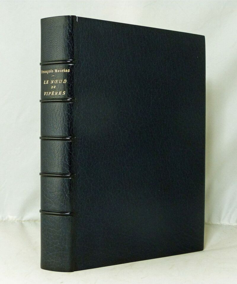 Leather-edged slipcase and shirt in night blue half-marrow. Full dark blue morocco binding. Spine to 5 nerves. Counter plates lined with full grey box. All edges gilt. Original paper covers and spine bound in. Binding signed J.P. MIGUET.