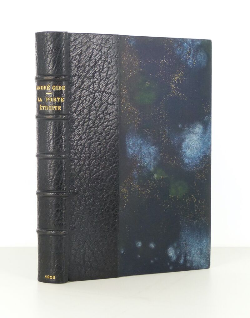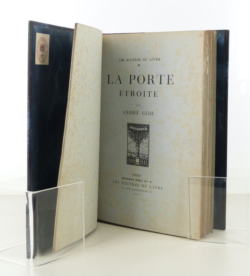 Reliure demi-maroquin bleu nuit. Couverture (jaunie) et dos conservés. Dos à nerfs avec date dorée en queue. Tête dorée. Non rogné. Reliure signée Lagadec. Avec un frontispice gravé sur bois par Paul Baudier.