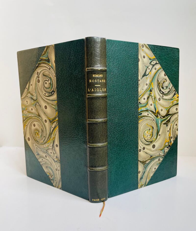 In leather lined case. Half maroquin binding with long green grain and corners. Nervous spine with golden title and author, date in tail. Top edge gilt. Original paper covers and spine bound in. Binding signed P.RUBAN. Clean and fresh interior. ORIGINAL EDITION.