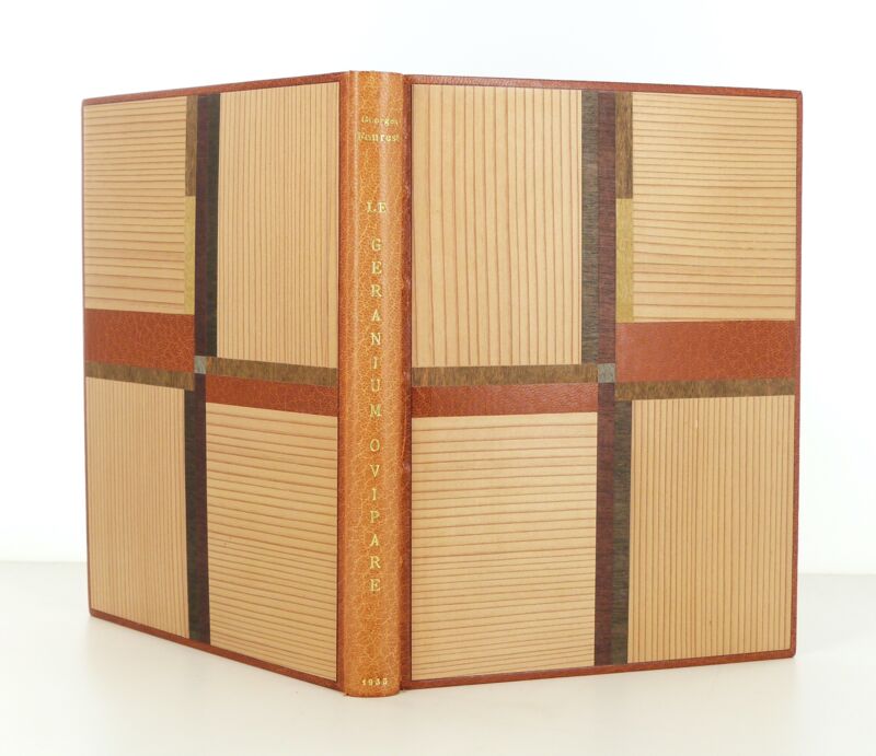 Sous étui bordé. Reliure maroquin fauve à encadrement. Dos lisse avec titre doré à la chinoise. Plats ornés d'une composition géométrique en basla et maroquin fauve. Tête dorée. Reliure signée C. et J.-P. MIGUET.