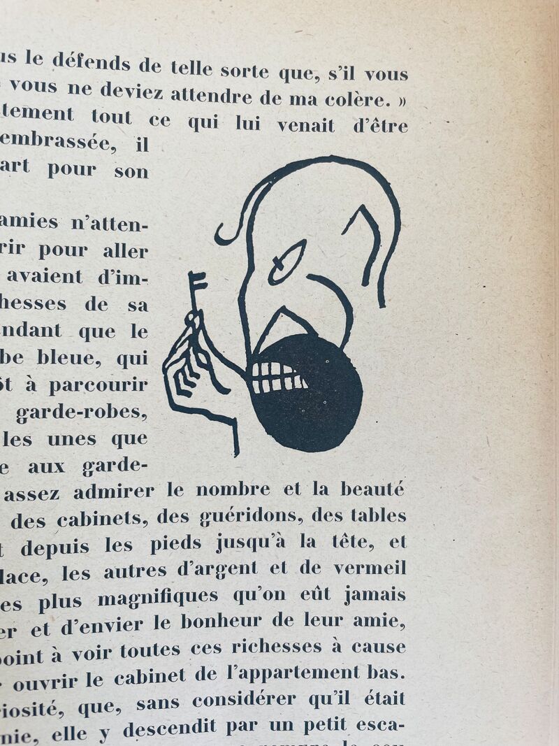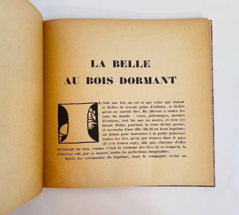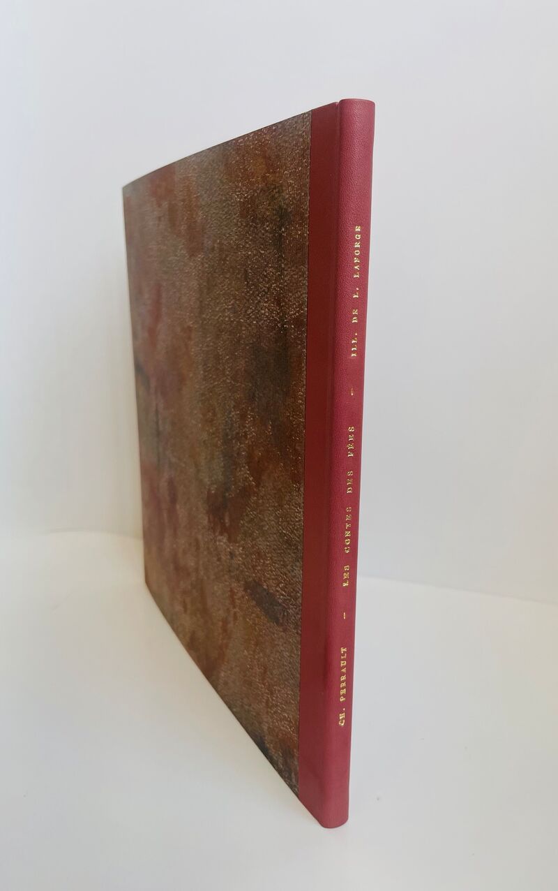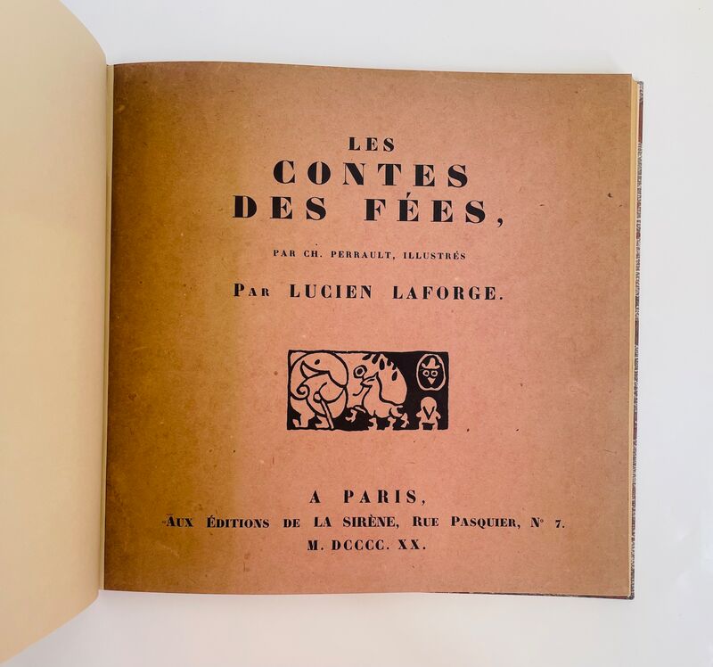 Recueil de huit contes de Charles Perrault, dont La Belle au bois dormant, Le Petit Chaperon rouge et Le Chat botté, chacun accompagné d'une planche en couleurs et de nombreuses illustrations en texte de l'artiste français Art déco Lucien Laforge (1889-1952). Les dessins fantaisistes aux couleurs posées en aplats ont été coloriés "au patron" par l'Atelier André Marty.