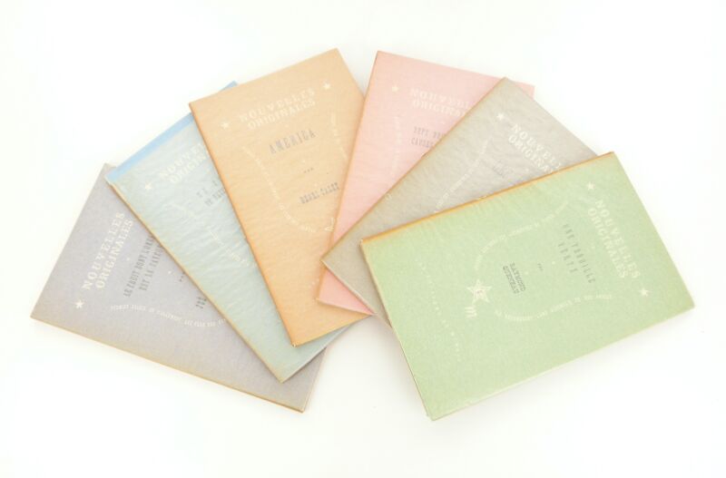 Sous étui cartonné noir. Couvertures souples à rabats de différentes couleurs. Avec les 6 titres suivants : Bousquet" Le Fruit dont l'ombre est la saveur", Calet "América", Henein "Un temps de petite fille", [Maast] Paulhan "Sept nouvelles causes célèbres", Queneau "Une trouille verte" et Vercors "Les Mots".