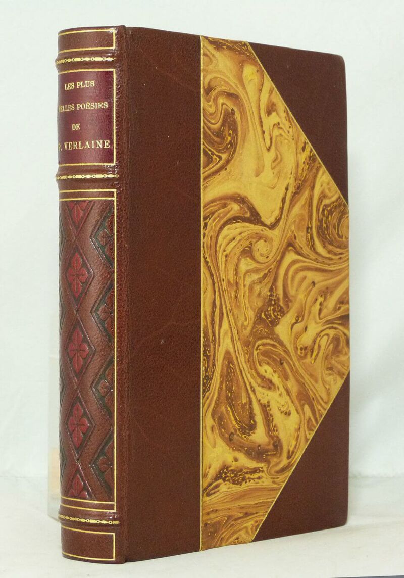 Binding half-chagrin brown corners. Pretty mosaic spine with small red diamonds. Top edge gilt. Cover kept. Binding signed FLAMMARION Original dry point by Edgar CHAHINE from Verlaine on the front. Minimal pricking on edges.