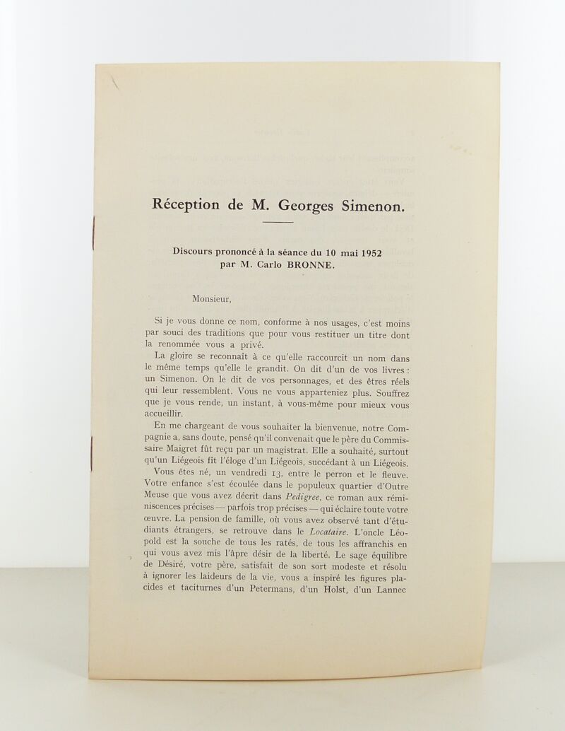 La réception de Georges Simenon à l'Académie royale de langue et de littérature françaises de Belgique, le 10 mai 1952, est un moment charnière qui marque la consécration officielle du « père de Maigret » par l'élite littéraire de son pays natal. Le discours de bienvenue a été prononcé par Carlo Bronne, magistrat, historien et homme de lettres belge.