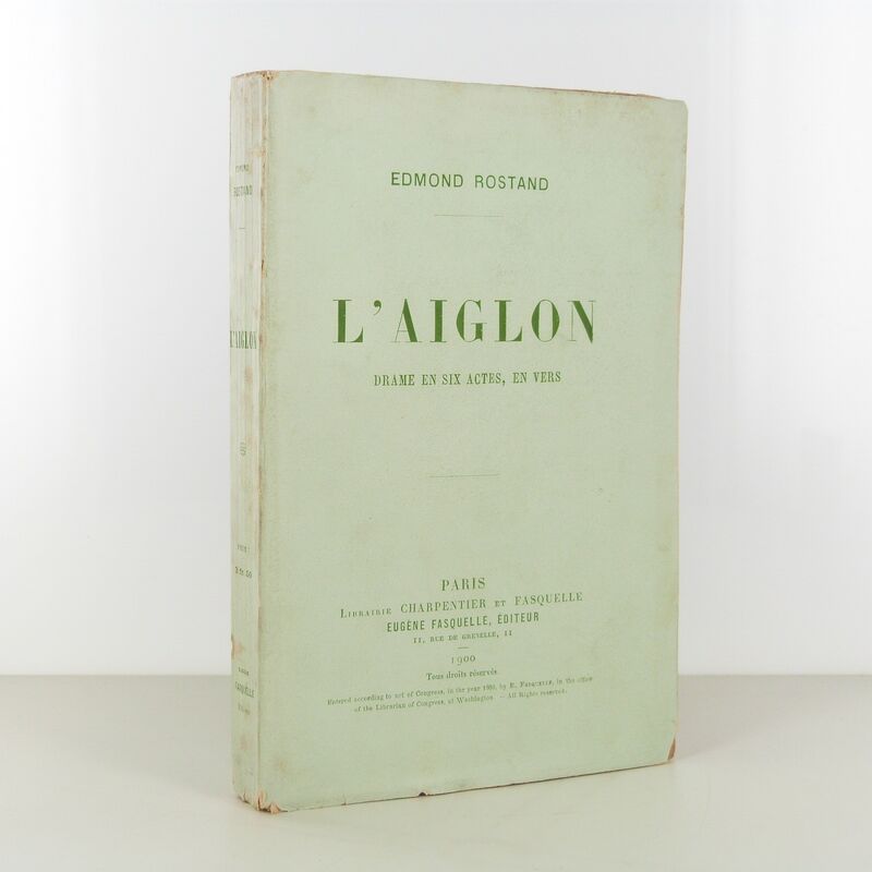 ORIGINAL EDITION of this Alexandrian play, which was first performed in Paris at the Théâtre Sarah-Bernhardt on March 15, 1900, with Sarah Bernhardt in the title role of the Duke of Reichstadt (the Eagle), and is enriched by an autograph letter signed Rosemonde Rostand and an autograph ticket signed by Sarah Bernhardt.