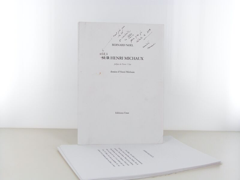 Complete set of corrected proofs of Vers Henri Michaux, Bernard Noël's study of the Belgian poet and painter Henri Michaux. Proofs are enriched with a few handwritten corrections, including one concerning the title, in which the former SUR is crossed out in favor of VERS: "Tant pis pour le 15 je souhaite ce VERS parce que je déteste le SUR, amitiés Bernard".