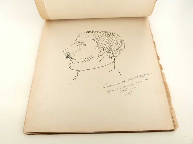 Each portrait, reproduced in black, is accompanied by a handwritten note from the author, a witticism intended to immortalize the portrait: "Aspires to leave his 80 horses to ride only one" or "despite his detachment from the things of this world, is forced to command them".