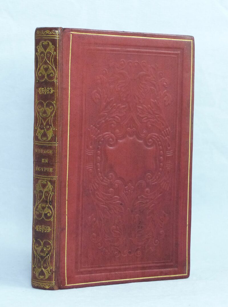 Cold-stamped red calf binding. Smooth spine decorated with gold mosaics. All edges gilt. Decorated with 7 off-text plates composed of 2 nice engravings each.