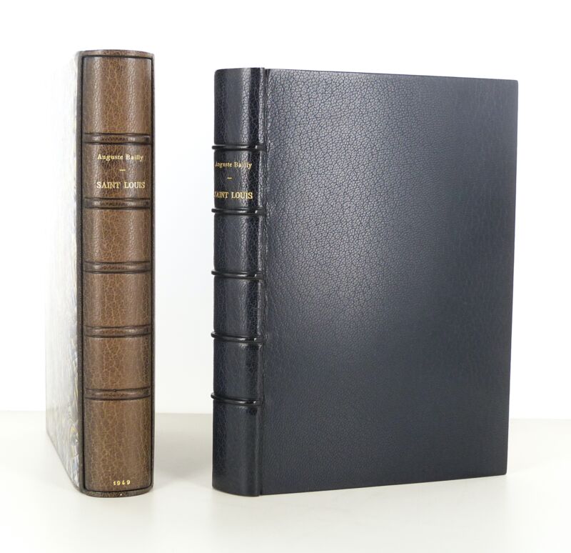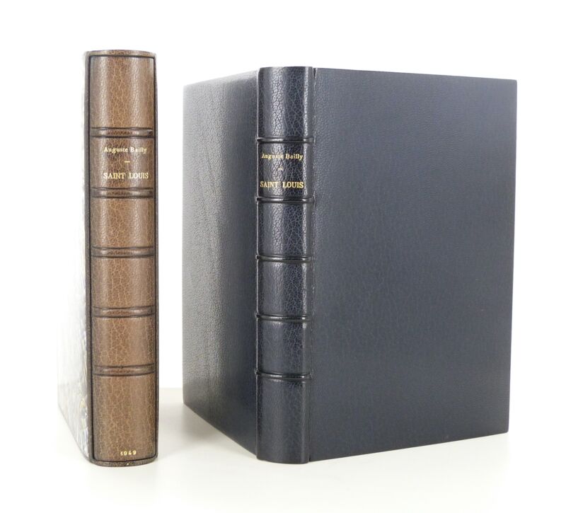 Sous étui bordé et sous chemise en demi-maroquin à petits recouvrements. Reliure maroquin janséniste bleu nuit. Dos à nerfs, titre doré en pied. Doublure de moire encadrée de maroquin et d'un filet dorée, gardes de moire jaune d'or. Toutes tranches dorées. Filets à froid sur chasses et coiffes. Couvertures et dos conservés. Reliure signée J.-P. Miguet.