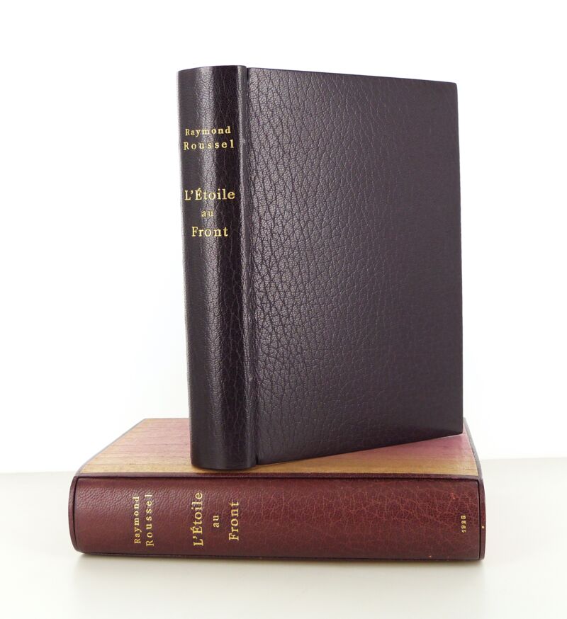 Sous étui bordé et sous chemise en demi-maroquin à petits recouvrements. Reliure plein maroquin prune. Dos lisse. Toutes tranches dorées. Couverture et dos conservés. Reliure signée J.-P. MIGUET. A grands témoins. Bien complet du cahier de "la critique et l'auteur de L'Etoile au front".